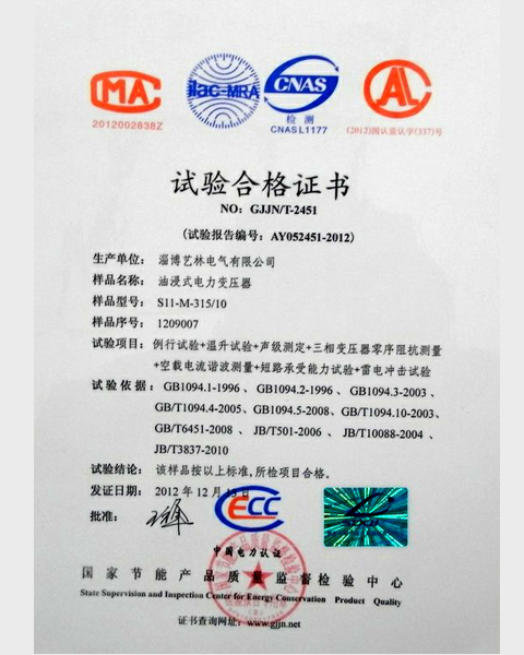 油浸式电力变压器合格证书