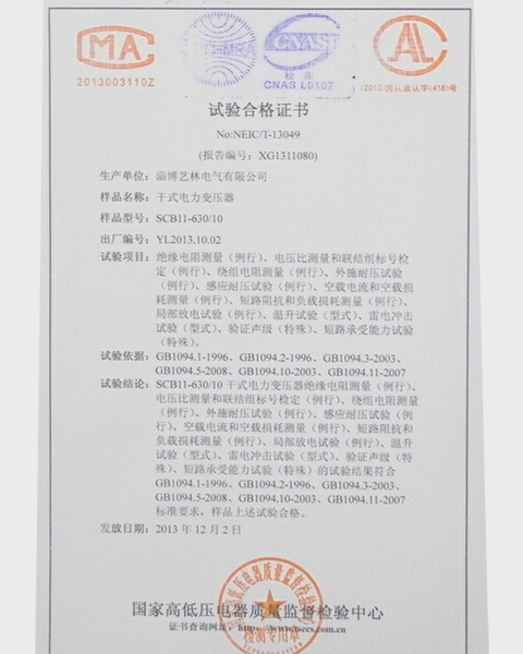 干式电力变压器合格证书